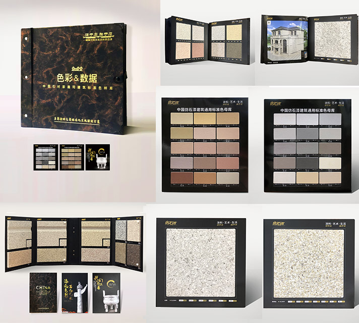 鑫浪原石樣板、通用仿石漆標(biāo)準(zhǔn)色卡中的仿石樣板均帶數(shù)據(jù)庫,并含有精確測量的色漿數(shù)據(jù)供參考。03 高端建筑外墻多彩涂料樣板集