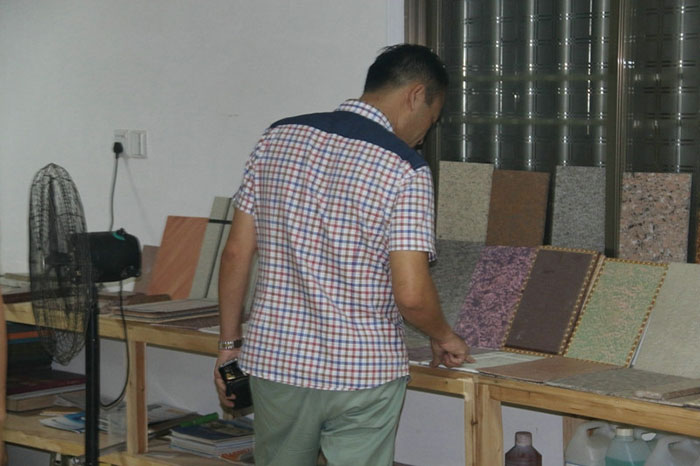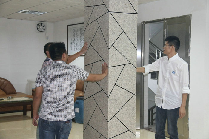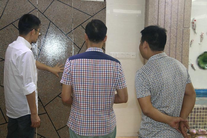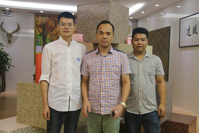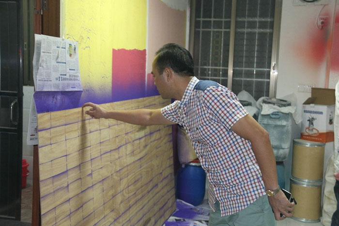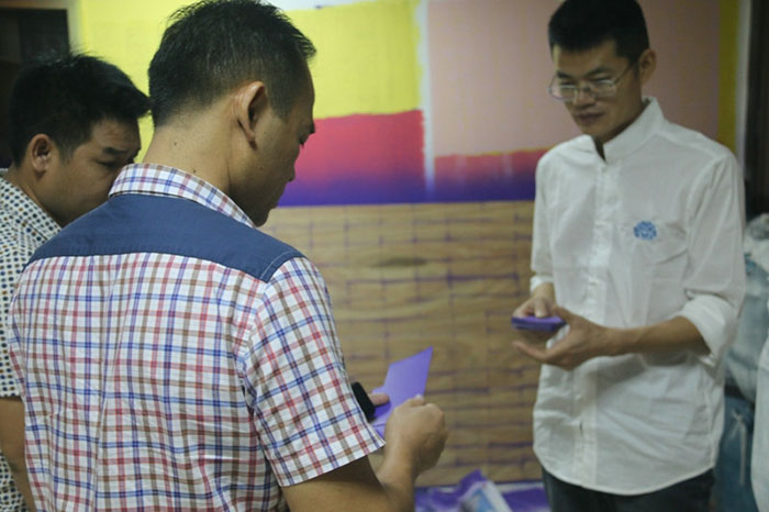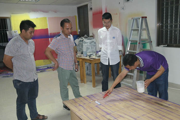 鑫浪700水包水多彩因其最低的成本、最簡便的施工工藝及產(chǎn)品穩(wěn)定性好等優(yōu)勢迅速得到了市場的認可,受到客戶及業(yè)內人士的一致好評。廣東順德康雅涂料實業(yè)有限公司李工等一行人為睹700水包水多彩風采,專程來到鑫浪化工與陳細艷總經(jīng)理交流水包水多彩技術。