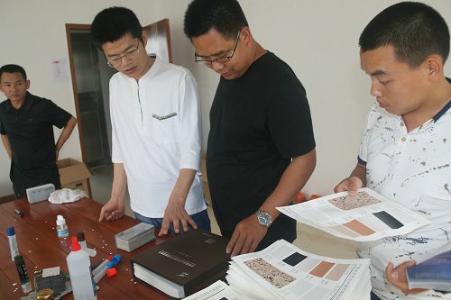 水漆以水代替有機(jī)溶劑為稀釋劑,不僅避免了油漆含有的有毒物質(zhì),在實(shí)現(xiàn)環(huán)保的同時(shí),還節(jié)約了石化資源。鑫浪化工自創(chuàng)辦以來(lái)一直致力于水包水多彩技術(shù)的研發(fā)與創(chuàng)新,力求研究出“高利潤(rùn)、高附加值、仿石效果最佳”的水包水多彩(液態(tài)花崗巖)水漆,700水包水多彩體系最終應(yīng)運(yùn)而生,并在短時(shí)間內(nèi)獲得廣大客戶的普遍贊譽(yù)。四川閬中志航建筑涂料有限公司總經(jīng)理夏果等一行人也慕名來(lái)到順德,與鑫浪化工總經(jīng)理陳細(xì)艷交流水包水多彩技術(shù),希望一睹700水包水的風(fēng)采。