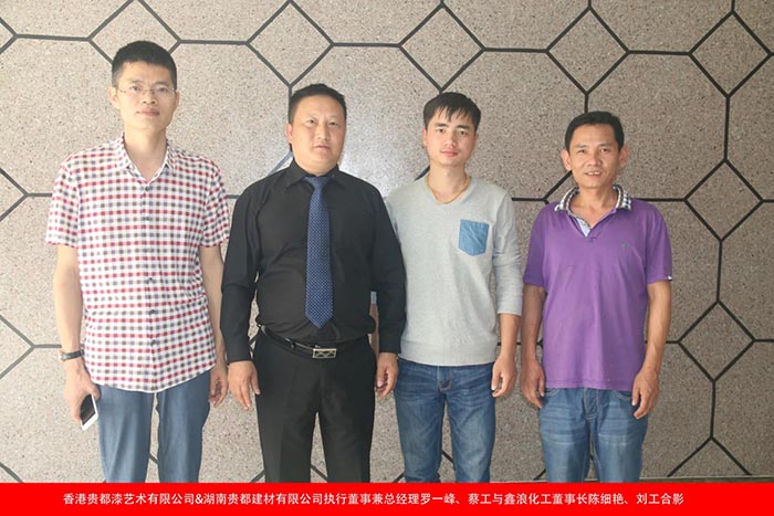 “貴都”(GUIDU)做為香港貴都漆藝術(shù)有限公司旗下的中國涂料應用領(lǐng)先品牌和抗開裂、防腿色專家,更是在中國首次提出“涂料藝術(shù)”新概念,把涂料施工上升為“涂料藝術(shù)”, 為建筑涂裝提供了最具實效的解決方案。香港貴都漆藝術(shù)有限公司&湖南貴都建材有限公司執(zhí)行董事兼總經(jīng)理羅一峰攜工程師蔡工此番前來鑫浪巧遇馳騁兩廣(廣西做房地產(chǎn)、廣東開膩子粉廠)預備上水包水項目的陳總,雙方皆知鑫浪700水包水體系的優(yōu)勢和配套完善的服務,更是得知鑫浪陳總的口碑與人品在業(yè)內(nèi)同樣有口皆碑,所以專程而來。