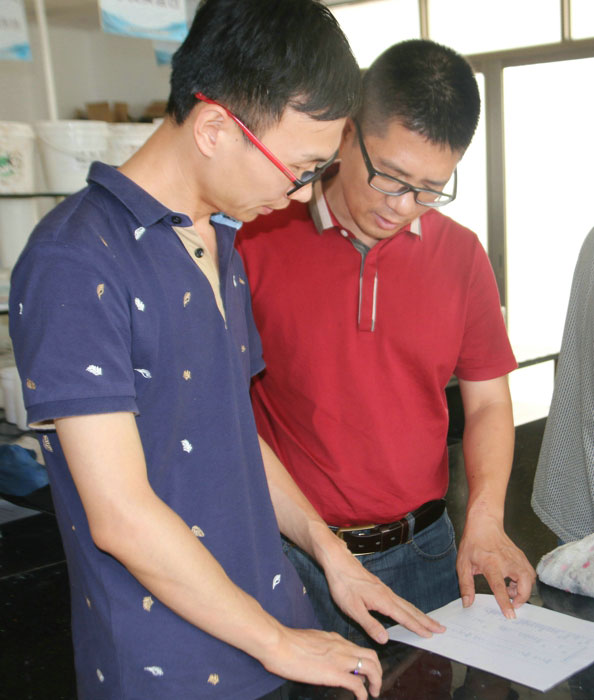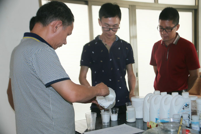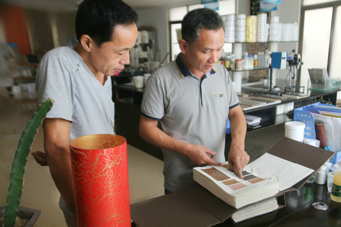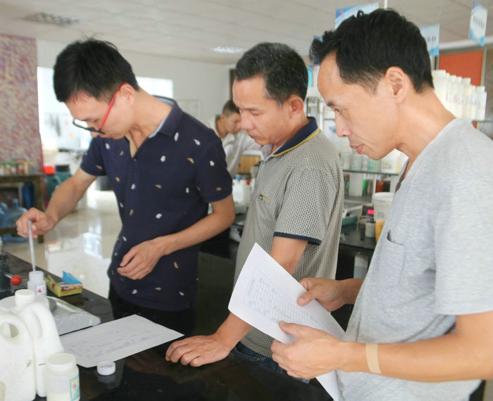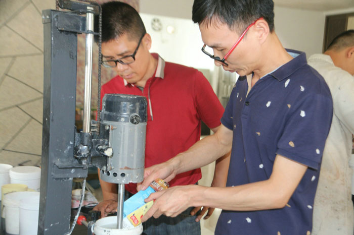 陶總、許工、陳工親自體驗700水包水多彩體系的生產(chǎn)與施工,并在顆粒兩小時表干后對樣板進(jìn)行泡水,顆粒無發(fā)白、起皺的現(xiàn)象。 700給永固交了一份滿意的答卷!